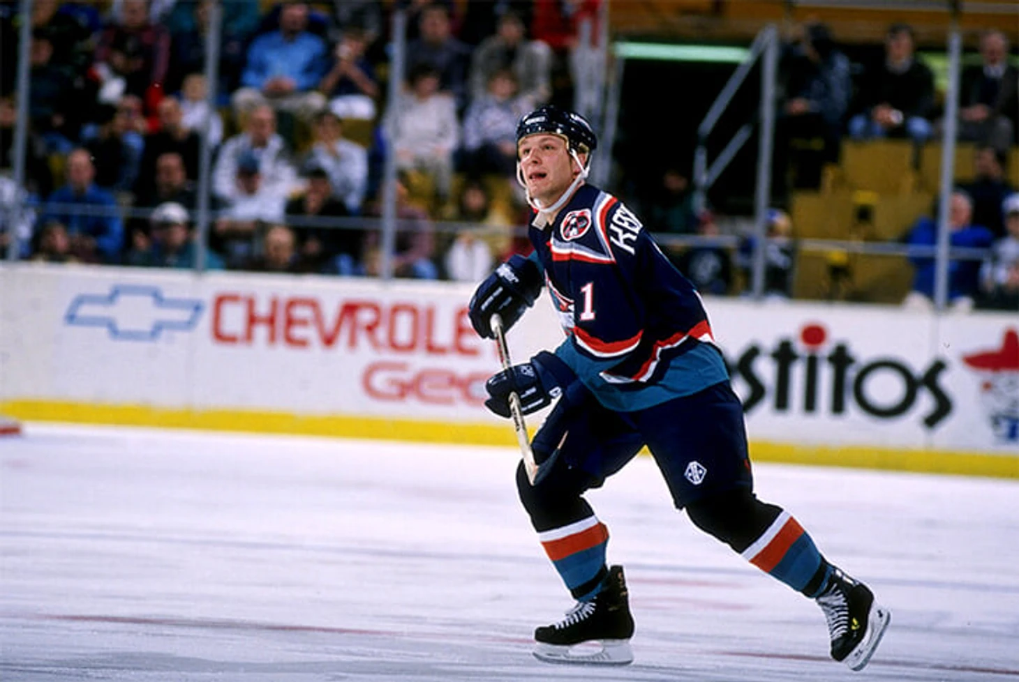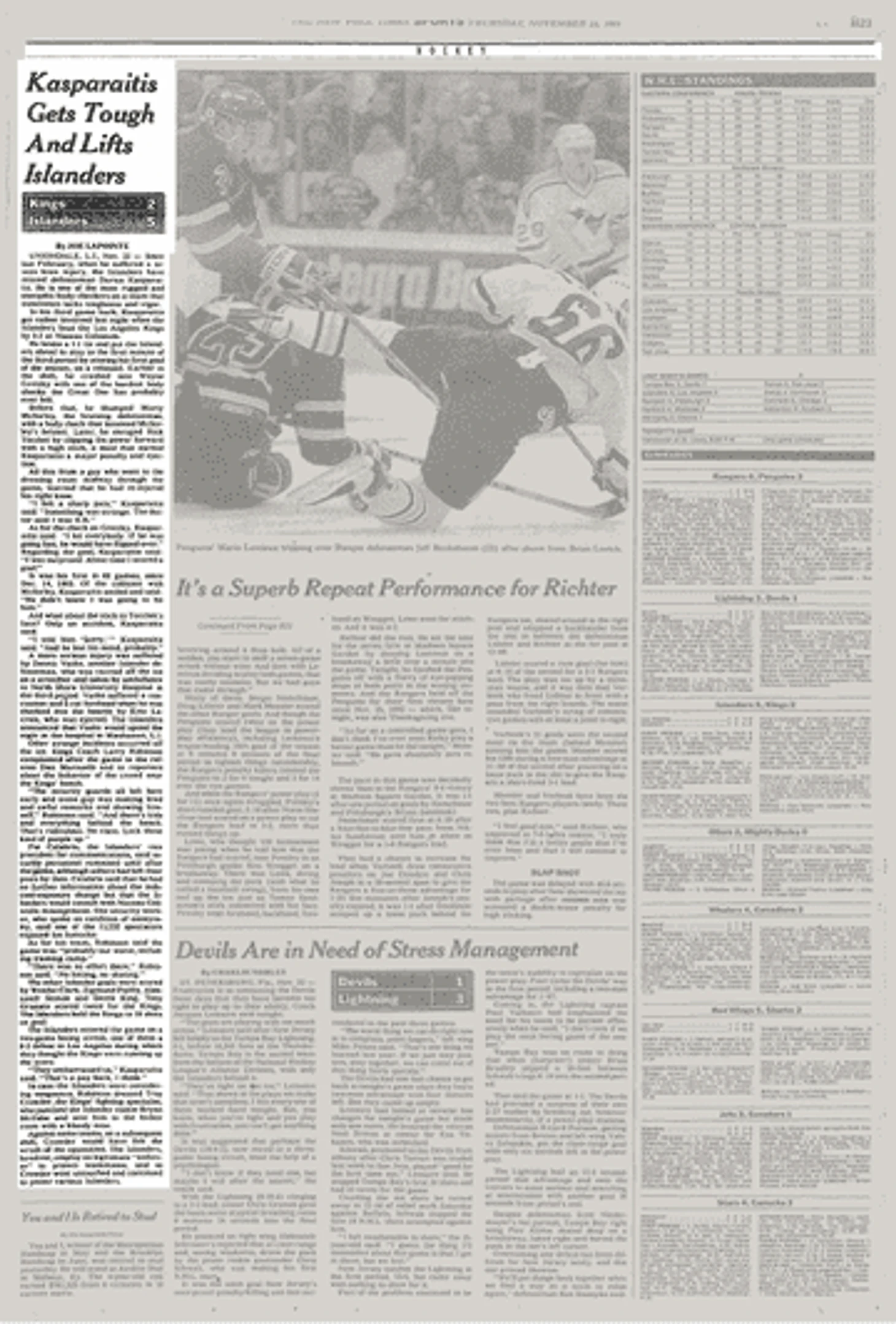 Но этого гола и всего перфоманса могло вообще не быть – и не только потому что Каспарайтис в принципе редко забивал (к матчу с «Кингс» его сухая серия составляла 66 матчей). Прошлый сезон – локаутный-1994/95 – он пропустил почти полностью из-за травмы колена и восстановился только к середине ноября.