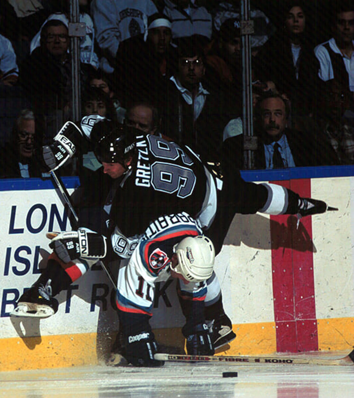 22 ноября 1995 «Айлендерс» принимали «Лос-Анджелес». После 40 минут счет был 1:1, и третий период начался с прессинга «островитян». Неожиданный «Бум» в сочетании с пошатнувшимся стеклом на 17-й секунде обозначил мощный хит 22-летней задницы Каспарайтиса на 34-летнем Гретцки – и Великий остался без шайбы.