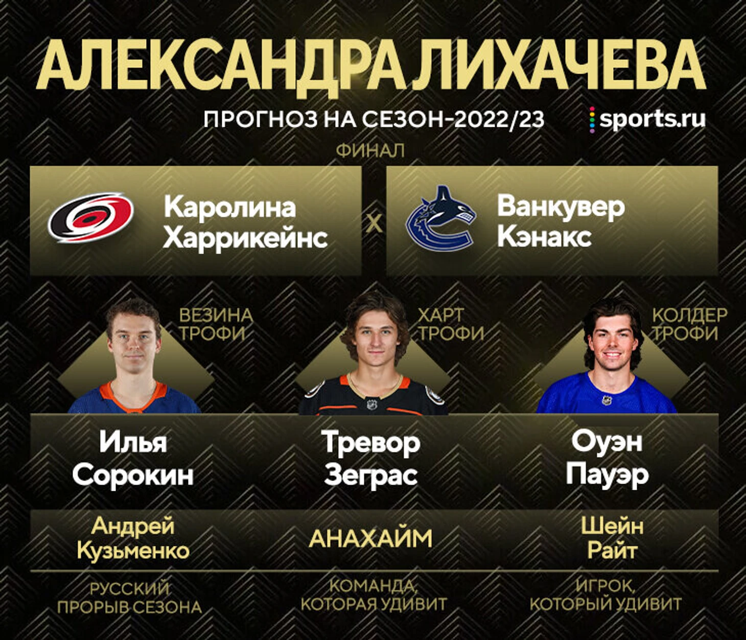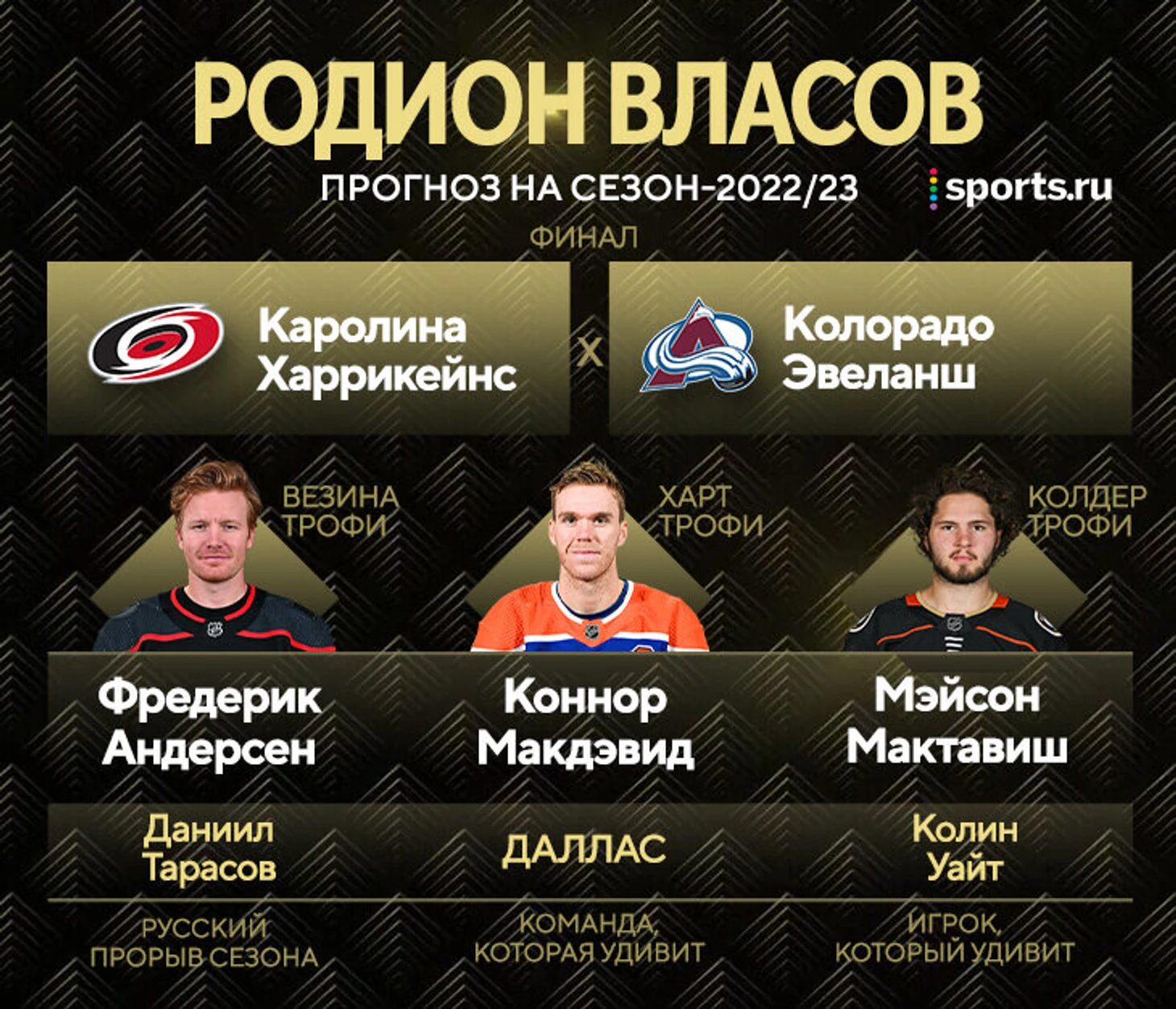 «Каролина» – «Ванкувер». «Банда придурков» точно украсит финал – плюс подкупает то, что на драфте НХЛ-2022 они выбрали четырех (!) русских. «Кэнакс» должны быть там как минимум из-за деда-матершинника Брюса Будро: на его ворчание после матчей можно смотреть бесконечно, а песня «Bruce, there it is» в плей-офф должна выбесить его так сильно, что аж понравится. Да и интересная в команде банда вырисовывается с Подколзиным, Кузьменко и Михеевым.