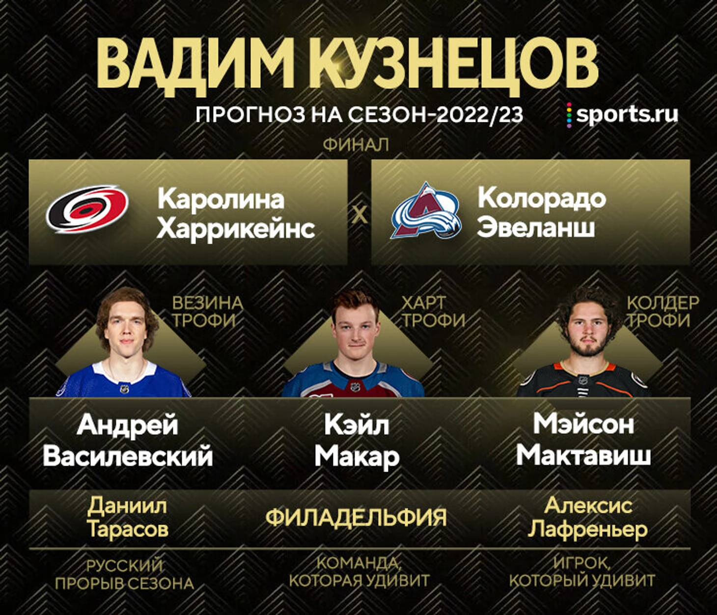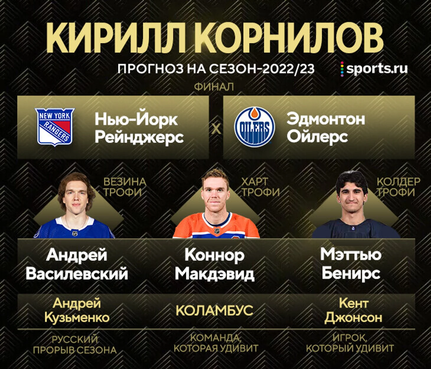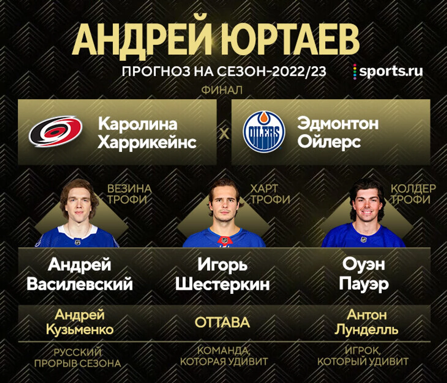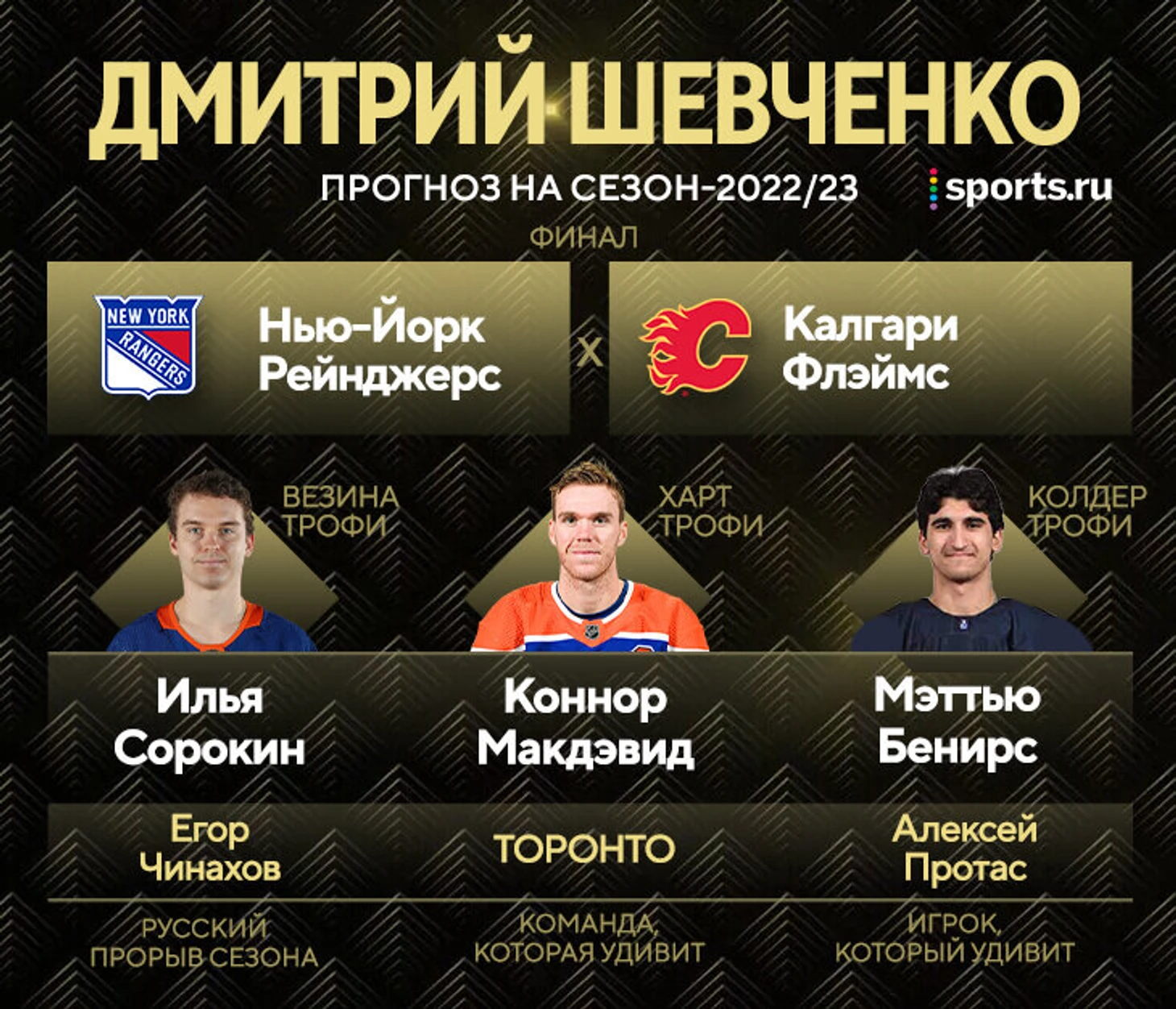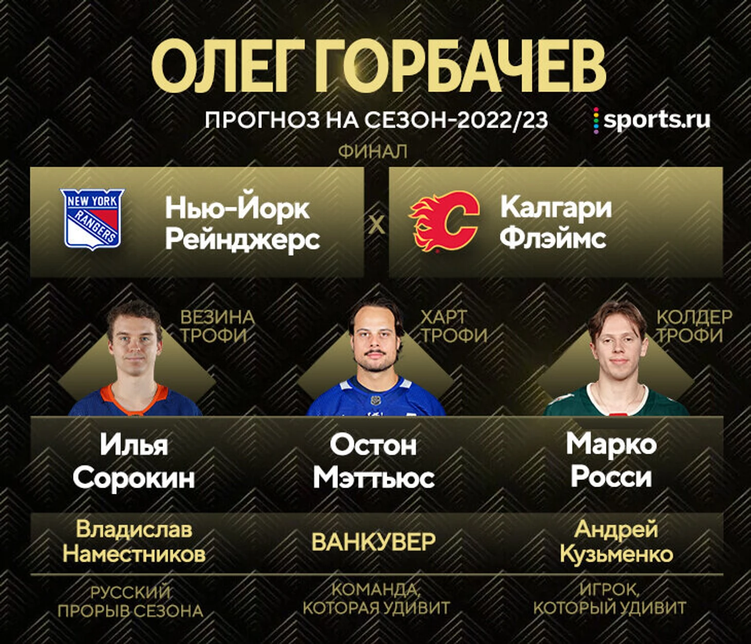 Игорь Шестеркин, «Рейнджерс». Поставлю на него, раз в прошлом сезоне был финалистом «Харта». Я вообще думаю, что «Рейнджерс» станут одним из главных разочарований – просто в силу того, как высоко они забрались в плей-офф-2022. Теперь все будут ждать от них следующего шага вперед, но, мне кажется, они весной и так прыгнули выше головы.