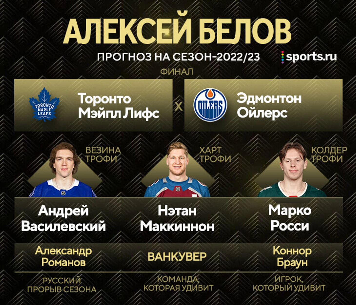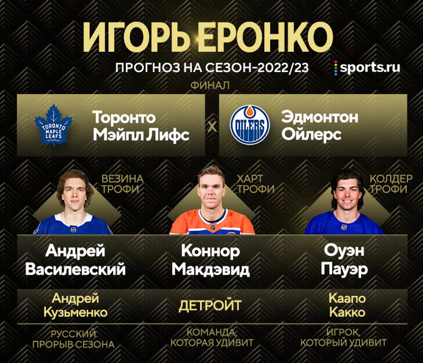 «Харт» Макдэвида скучно предсказывать, но при прочих равных, думаю, отдадут ему – чтобы прокладывать дорогу к будущей борьбе с Гретцки если не по командным, то про индивидуальным наградам. А Василевский явно заждался второй «Везины» – верю в него, хоть Шестеркин и фаворит.