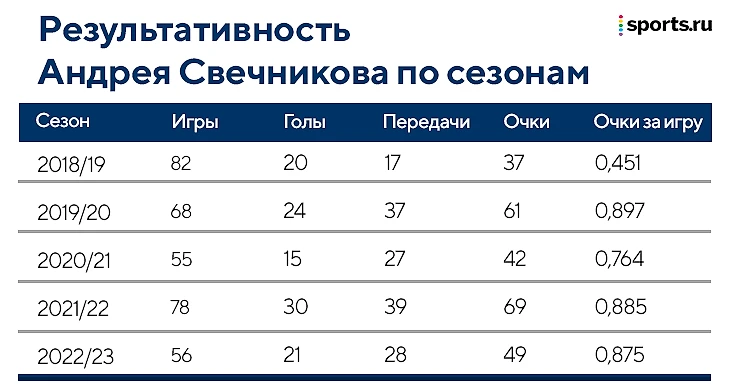 Средняя результативность Свечникова сейчас примерно ненамного ниже уровня прошлых сезонов. Он набирает меньше очка за игру, но так было и прежде.