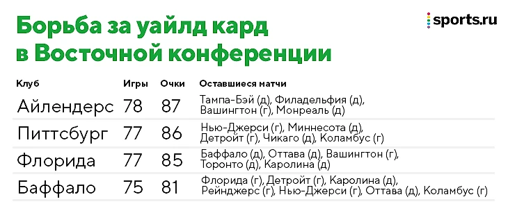 Прямо сейчас сразу у четырех клубов есть вполне осязаемые шансы на розыгрыш Кубка Стэнли – ни один из них еще ничего себе не гарантировал, но игр остается меньше и меньше. Помимо «Пингвинс», это «Айлендерс», «Флорида» и «Баффало». У «клинков» пока меньше всех очков, но есть два матча в запасе, победы в которых приблизят их вплотную к этой троице.