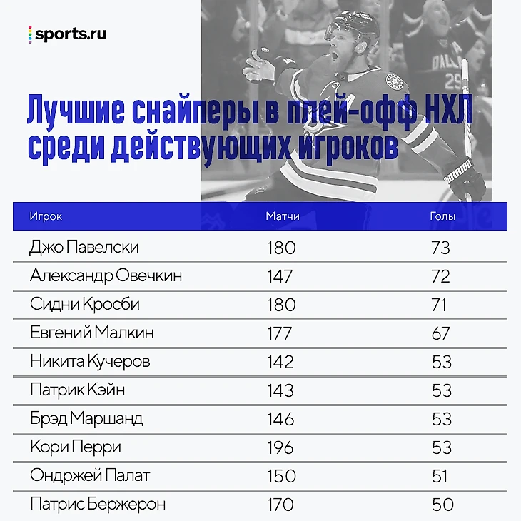Этот гол по-своему особенный для Джо – уже 73-й в плей-офф. Теперь американец – лучший снайпер в розыгрышах Кубка Стэнли среди действующих игроков. Позади него целая банда из солидных и уважаемых хоккеистов, часть из которых этой весной либо вообще не играла в плей-офф, либо закончила на ранних стадиях.