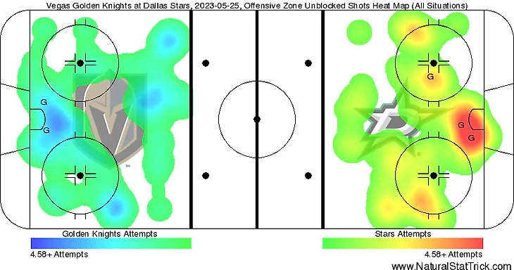 Стоит отдельно подсветить карту бросков. Если верить официальной статистике на сайте НХЛ, то по броскам в створ было 42-39 в пользу «Старс». Но самое важное, что в слоте больше и активнее работали именно игроки «Далласа». Интересно и то, что «Вегас» был похуже на пятаке, но все равно забил оттуда два гола. Плюс ко всему, вас не должна смущать отметка еще одной шайбы «звезд» – она в круге вбрасывания, но если бы за несколько секунд до гола под воротами не потрудился Хинтц, то, возможно, и гола не было бы.