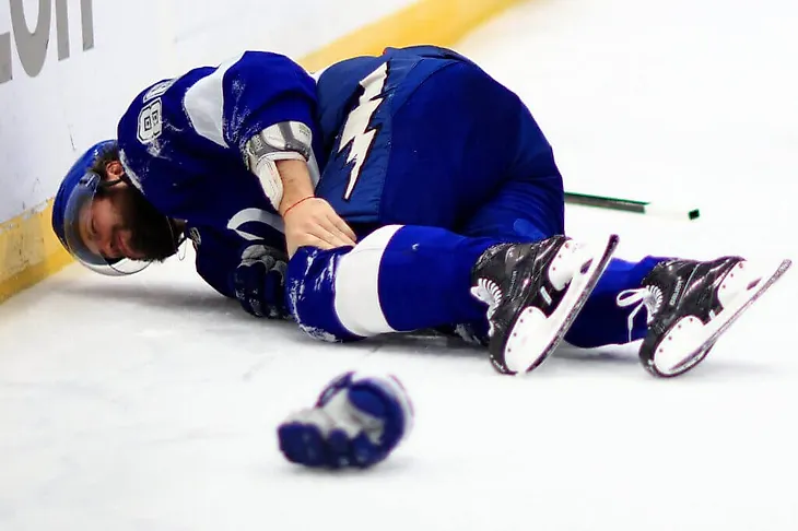 Автор Егор Параскун Кучеров получил травму на ровном месте. После легкого контакта с соперником схватился за пах и больше не выходил на лед