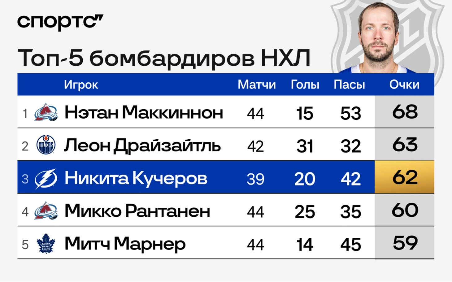 Благодаря очередной успешной игре (пятый матч подряд с очками) Никита вошел в топ-3 бомбардиров НХЛ. Причем у Кучерова сыгранных матчей меньше всех в пятерке лучших – 39.