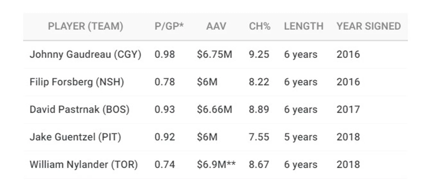 Босер пропустил несколько игр из-за травмы в этом сезоне, но его статистика (0,81 очков в среднем за игру за 69 матчей) позволяет поставить в один ряд с игроками выше. В пользу Босера точно сыграет повышение потолка до $83 миллионов. Это повышение даст возможность ему опередить всех игроков из списка по годовой зарплате. Если брать контракты новичков, то Босер также лучший среди них по голам в среднем за игру – 0,42. Голы для снайпера – лучший аргумент при обсуждении контракта.