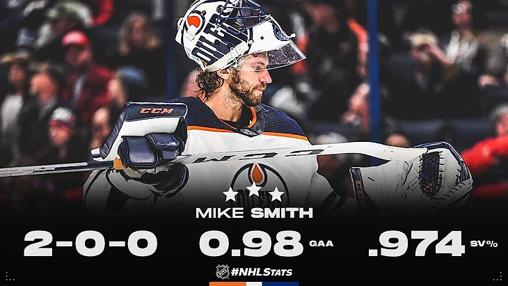 Третья звезда - Майк Смит, "Эдмонтон" - 2 игры, 2 победы, 97.4% отраженных бросков