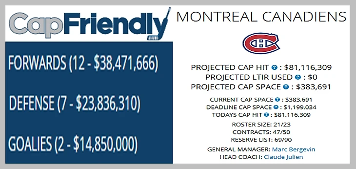 Я писал в предыдущей статье что оценивать результаты работы генеральных менеджеров команд нужно исходя из возможностей и ресурсов конкретного клуба, целей и задач. Привожу картинку платёжки Канадиенс  с capfriendly от 25 октября. Другие данные по составу, зарплатам и т.д. в статье приведены с Capfriendly, Hockeydb и TSN.