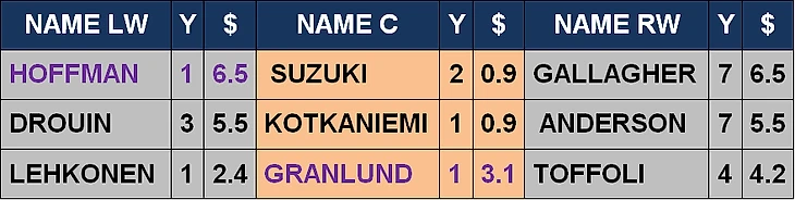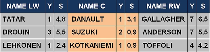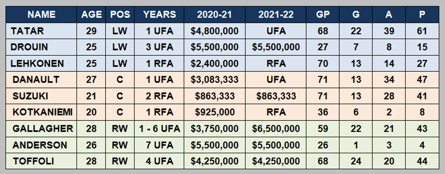 Если не предпринимать больше никаких шагов, после окончания сезона заканчивается договор с: Татар, Дано, Армиа, Уил. Вступают в действие новые соглашения Галлахера, Петри, Аллена (если Аллена не заберут на драфте расширения).  Надо помнить о своих хоккеистах RFA: Котканиеми, Лехконен, Мете. Поэтому положение напряжённое. С центрами ситуация перспективная. При дальнейшем прогрессе Сузуки, Котканиеми, Полинга, нет никаких проблем. Надеюсь Бержевен избежит искушения прикупить ещё парочку игроков на правый фланг. Левый крайний необходим, кто именно большой вопрос. Если Татар захочет перезаключить сейчас контракт действующий с сезона 2021/22 по примеру Галлахера, только с вменяемым сроком и кэпхитом то это вариант. Если нет, то следует задуматься об его обмене, или заранее согласиться потерять после сезона. Привожу примерную наглядную таблицу атаки топ-9 Монреаля сейчас.