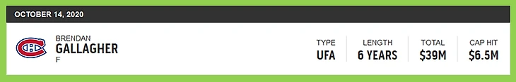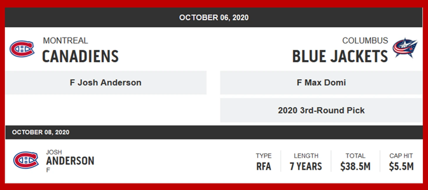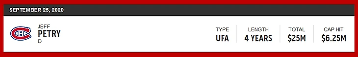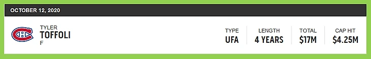 Невольно возникает вопрос, кого Канадиенс  видят играющим в третьей тройке и не высоковат ли кэпхит для игрока нижней шестерки. Или они приобрели троих игроков RW заранее зная, что кто-то из них будет переведён на левый фланг?  Что-то мне эта ситуация смутно напоминает. Есть один игрок обороны по имени Тони, фамилию не помню, кажется начинается с буквы Д, клуб тоже подзабыл, из глубинки Америки.