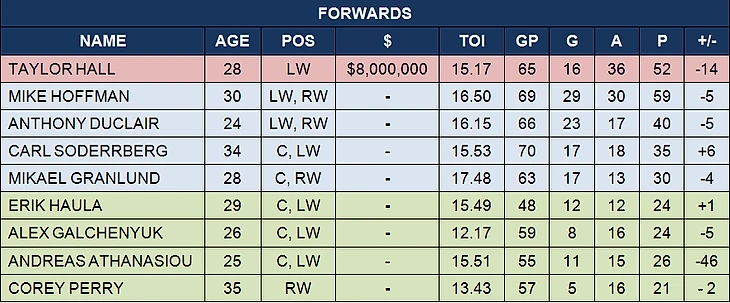 Даже Майк Хоффман обойдется дороже в пределах до миллиона при кратком сроке, не говоря уже о Дюклере и т.д. Ещё свободен Перри. Если уж так необходим был форвард на срок более года почему не свободный Дадонов? Хотя и это была бы большая глупость. Андерсон может провести удачный сезон. Но разве нет альтернативных игроков UFA при схожем кэпхите. Некоторые лучшие свободные игроки приведены в таблице внизу статьи.