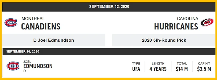 Сначала про трейд Эдмундсона. Компенсация за него крайне невысока. После приобретения с левым защитником был подписан четырехлетний контракт с кэпхитом $3,5 млн, вызывающий у меня много вопросов. Цель подписания понятна, получение надежного напарника в пару к Джеффу Петри.
