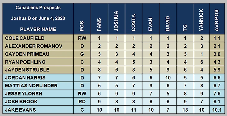 Ниже приведена картинка с рейтингом проспектов Монреаля с Canadiensprospects от 4 июня 2020. Результаты драфта 2020 естественно не учитывались. Колонка справа итоговый сводный балл, есть колонка с опросом фанов Хабс. Обратите внимание у подавляющего большинства первая четвёрка находится в своих пределах. Колебания результатов с Jayden Struble объясняется его травмой.