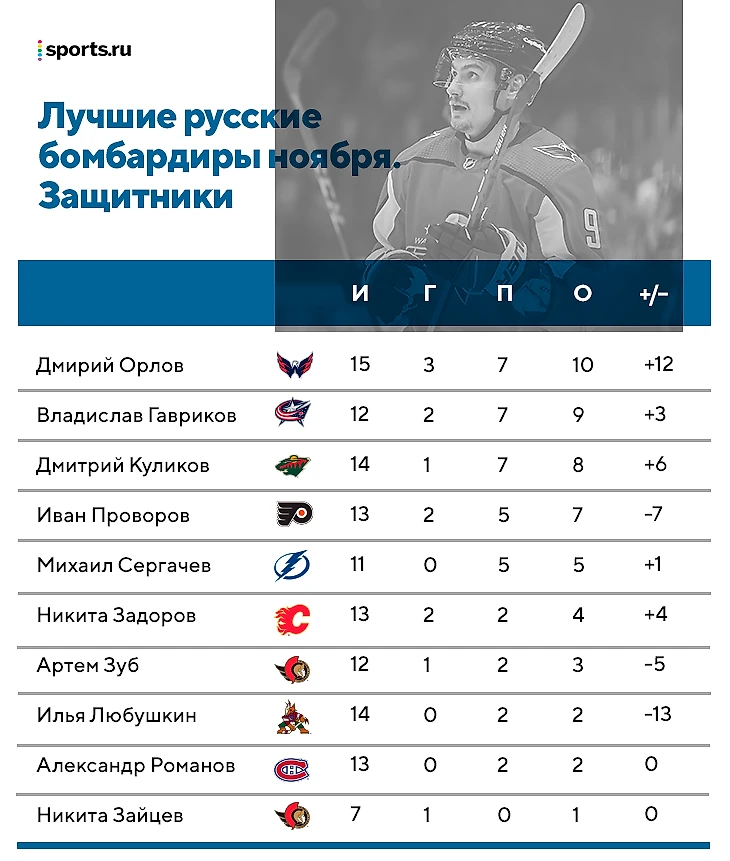 Орлов и Гавриков провели выдающийся месяц и заслужили повышение. Сергачев держит стабильно хороший уровень без взлетов и падений. Романов в «Монреале» прогрессирует не так быстро, как хотелось бы, но играет стабильно и надежно – в ноябре из основных монреальских защитников только он не ушел в минус.