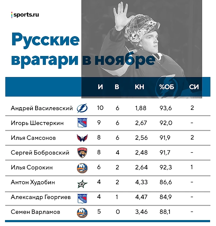 Илья Самсонов в ноябре был великолепен, ни разу не проиграл в основное время, одержал шесть побед подряд, дважды сыграл на ноль, отобрал у Витека Ванечека первый номер. Но, как видите, по статистике он совсем чуть-чуть лучше Сергея Бобровского. Но за ноябрьский перформанс заслужил поехать на Олимпиаду третьим вратарем.