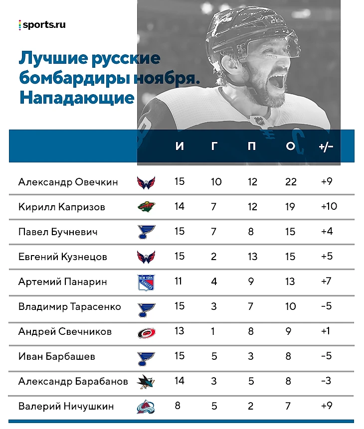 Панарин в этом сезоне все еще далек от топа бомбардиров – в позапрошлом сезоне он был третьим после ДрайМака, а в прошлом много пропустил, но по средней результативности тоже был третьим после МакДрайза. Сейчас же он обитает в районе 25-го места. Непосредственно в ноябре он даже в топ-30 не попал, но это потому, что у «Рейнджерс» было мало игр, так-то он прибавил (октябрь – 8 очков в 9 играх, ноябрь – 13 в 11). В Нью-Йорке Панарину не с кем играть в пас, Капризов в сборной это исправит.