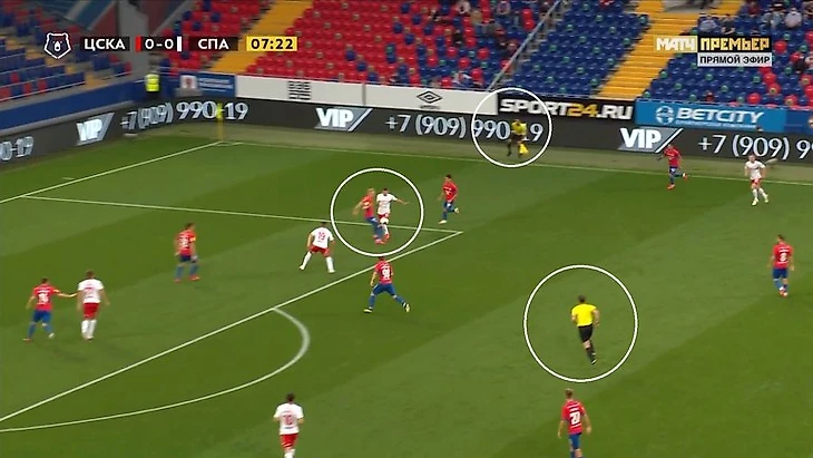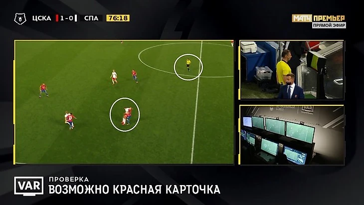 Сейчас поговорим об удалении. Этот матч не мог пройти без судейского скандала. На 77 минуте игрок Спартака Роман Зобнин врезается сзади в игрока ЦСКА. Судья Алексей Еськов показывает Зобнину жёлтую карточку и на этом кажется, что момент закончен, но нет, Еськов слушает VAR 2 минуты и после этого идёт смотреть, и тут уже у меня не было никаких сомнений, что игроку покажут красную карточку.