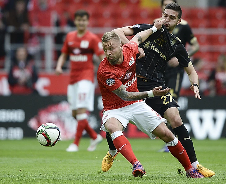 Уже привычный акцент на фланги в игре «Рубина» если и был сделан, то футболистами был реализован едва ли. Испытывающие проблемы с составом казанцы толком не смогли доставить мяч в штрафную до Игоря Портнягина. Самый результативный россиянин премьер-лиги четыре раза переиграл защитников «Спартака» в воздухе, но всякий раз делал это вдалеке от штрафной площади Реброва, а потому привычной опасности для соперника не таил. Даже выход на поле Максима Канунникова ситуацию не изменил. Достаточно сказать, что самую реальную возможность забить казанцы имели после стандарта – удару Карлоса Эдуардо со штрафного чуть-чуть не хватило точности.