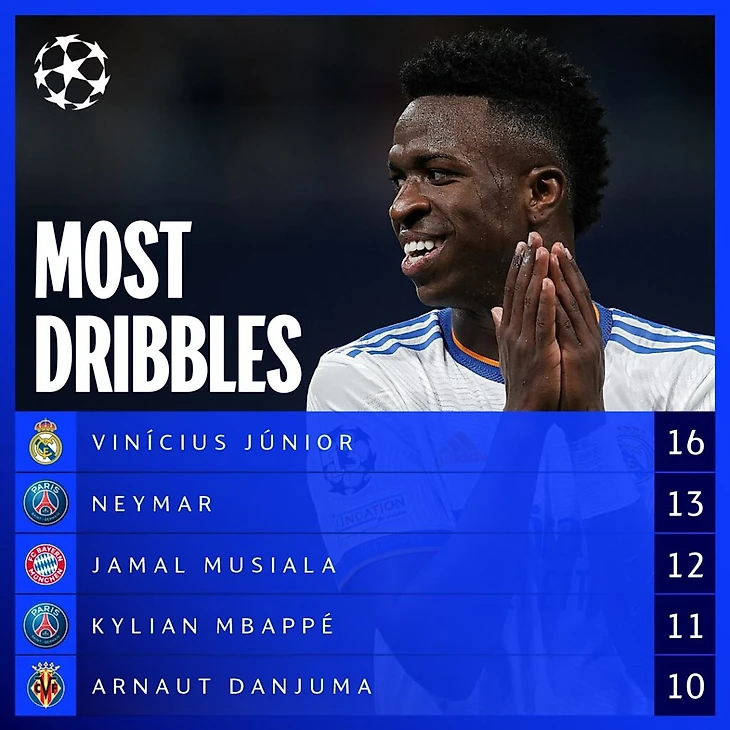В список пяти лучших игроков, которые провели наибольшее количество обводок, входят Джамал Мусиала (Бавария) с 12 обводками, Мбаппе (ПСЖ) с 11 обводками, занявший четвертое место, и, наконец, Арнаут Данжума (Вильярреал) с 10 обводками.