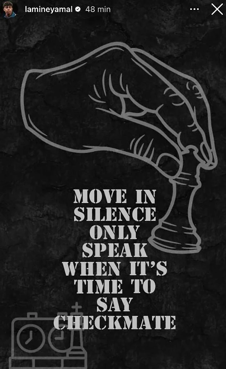 Перед матчем с Францией Ямаль отметился «волчьей» цитатой с изображением шахматной игры: «Ходи молча. Говори только тогда, когда пришло время сказать «мат».