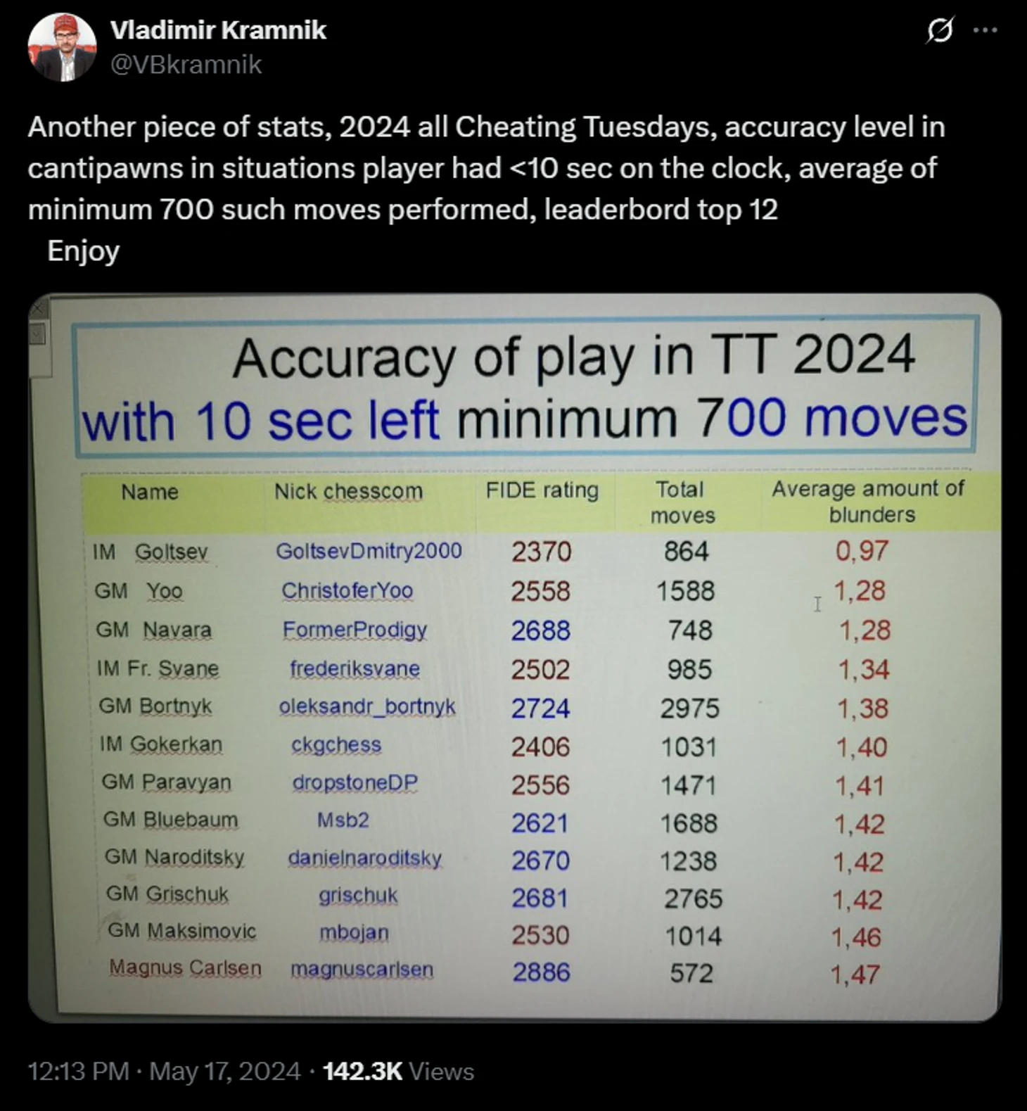 В таблицу вошел средний показатель «зевков», то есть ошибок. Наименьший был у шахматиста Дмитрия Гольцева (ого!), на 12-м месте – Магнус Карлсен, на 10-м – Александр Грищук, а на 3-м – как раз Навара.