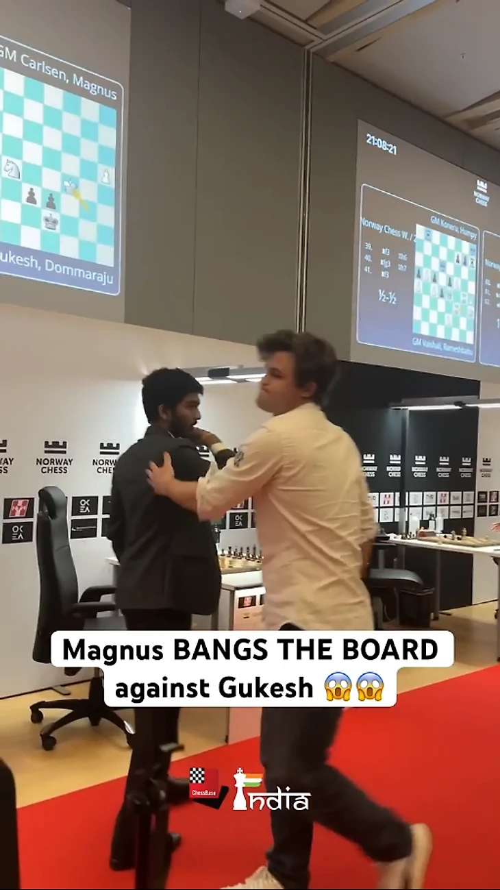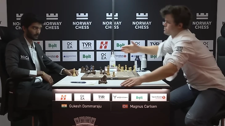 В эндшипиле 19-летний Гукеш с лишним конем обскакал проходные пешки норвежца, и тот, признав поражение, вспылил. Съежился и треснул кулаками по столу!