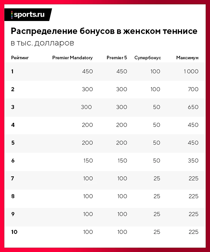 WTA создала для теннисисток топ-10 бонусный пул за участие в Premier Mandatory и Premier 5, который составляет 4,5 миллиона долларов. Чем выше рейтинг теннисистки, тем больше она может получить: например, для первой ракетки мира максимум – миллион долларов, для десятой – 225 тысяч.