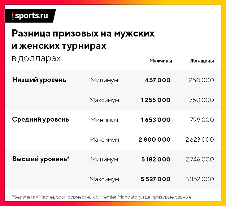 На самых престижных соревнованиях тура мужчины тоже получают больше – примерно на 2 миллиона долларов. Из исключений только «Большие шлемы», а еще Индиан-Уэллс, Майами, Мадрид и Пекин, относящиеся к женской категории Premier Mandatory: правила обязывают их обеспечивать одинаковые призовые фонды (Пекин сравнивают с «Мастерсом» в Шанхае, потому что по категории он сопоставим с ним, а не с проводящимся параллельно турниром 500).