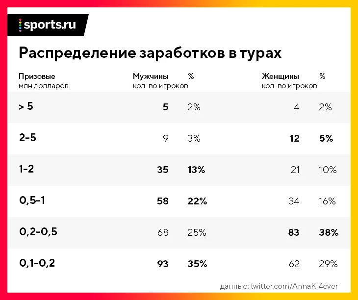 Из-за разницы призовых на низшем и среднем уровнях в женском туре меньше игроков, заработавших 100 тысяч долларов за год: на момент начала итогового турнира WTA 216 против 268. Кроме того, средний класс меньше как в абсолютном, так и в процентном соотношении.