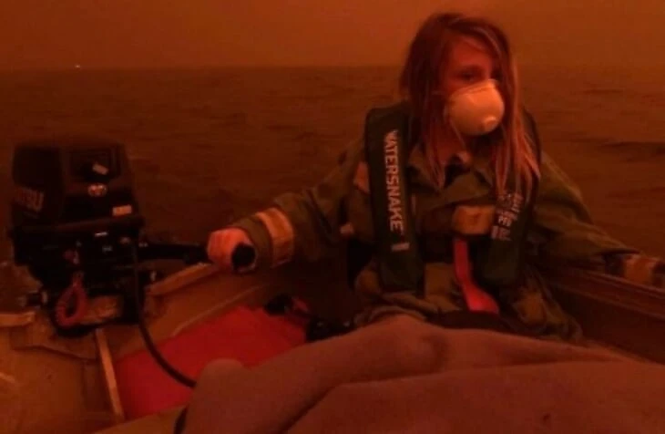 • Это фото сделано в 9:45 утра. Поскольку город полностью окружен огнем, людей оттуда эвакуировали кораблями и военными вертолетами. А вообще для ликвидации пожаров провели самую масштабную мобилизацию военных со времен Второй мировой.