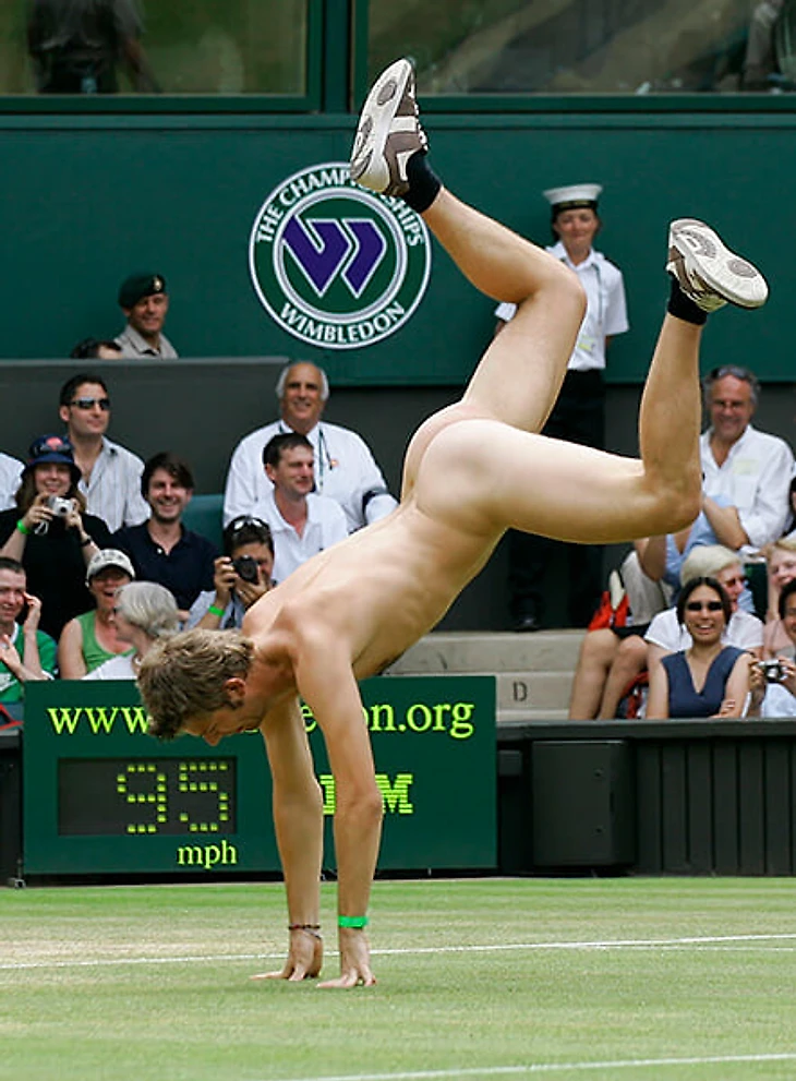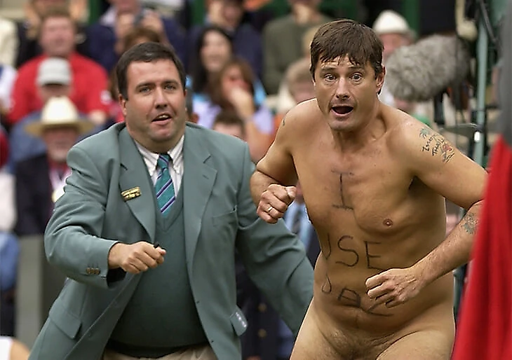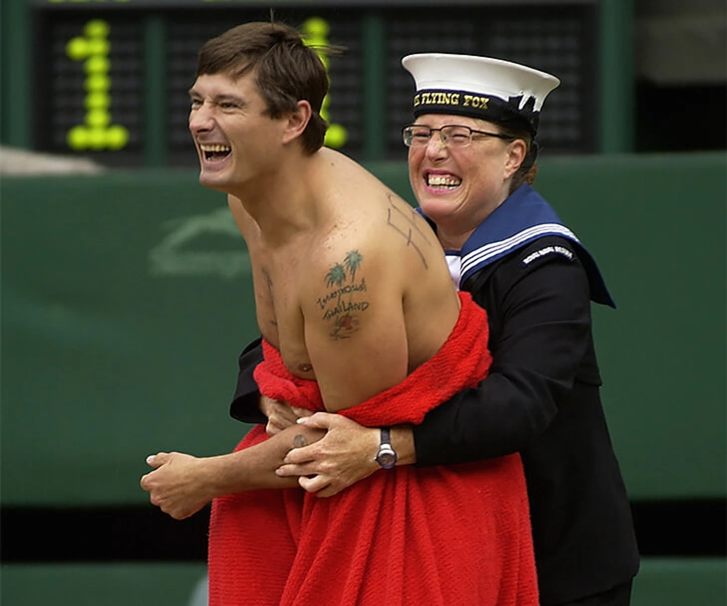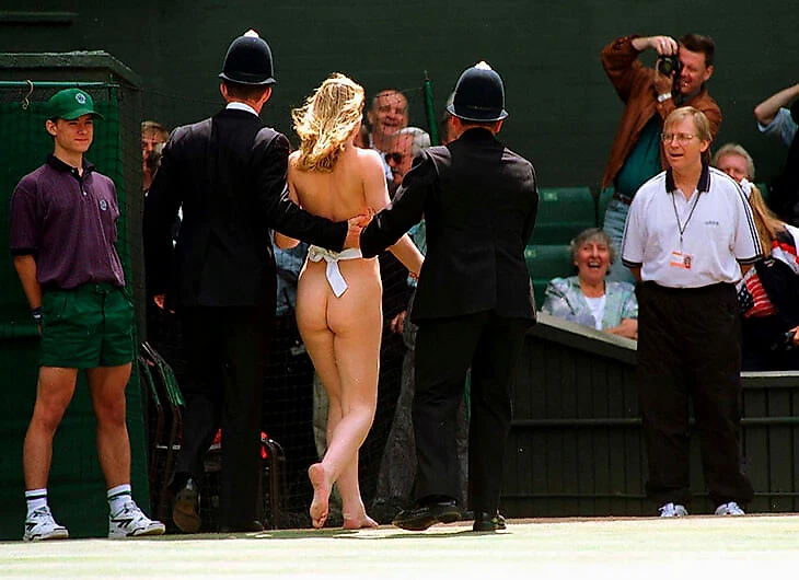 После Джонсон стрикеры на Центральном корте появлялись несколько раз – но это всегда были голые мужчины. В 2002-м на мужском финале между Ллейтоном Хьюиттом и Давидом Налбандяном на корт выскочил легендарный британец Марк Робертс, который 565 раз врывался на разные мероприятия в 23 странах. С Центрального корта его увели замотанным в красные покрывала.