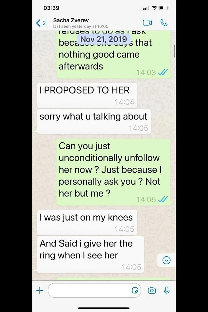 Зверев в разговорах с Шарыповой отрицал, что у них отношения. А во время турне по Латинской Америке с Роджером Федерером в конце 2019-го позвонил Шарыповой по фейстайму, встал на одно колено и сделал ей предложение.