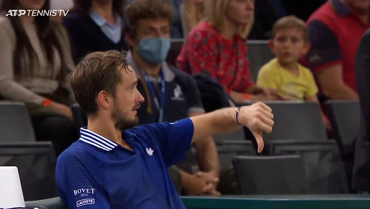 2:5 В переходе Медведев жаловался судье: «Легко наслаждаться, когда у тебя нет мозга. Можно кричать перед подачей. Какая разница?»