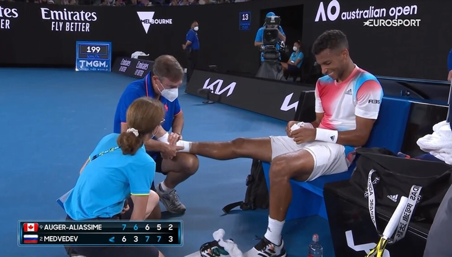 3:2 Но потом Даниил не принимает две подачи. А к Феликсу выходит физио. Медицинский перерыв.