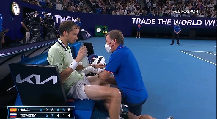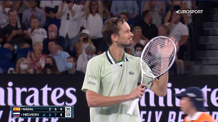4:5 Закрыл гейм идеальным дропшотом. Надаль будет подавать на титул. Медведеву снова мнут бедра.