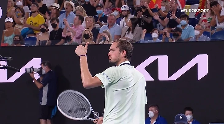 А Медведев после гейма просит судью жестче контролировать зрителей. Говорит: «Пожалуйста» недостаточно. Они идиоты, для идиотов этого мало».