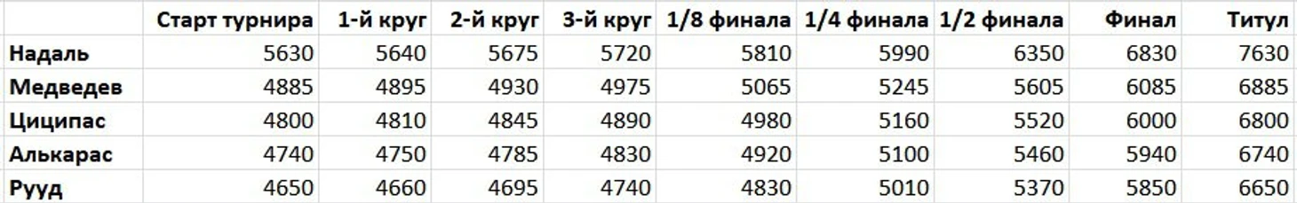 • Циципасу, Алькарасу и Рууду титула может быть недостаточно – если в финале они обыграют Надаля. Соответственно, Надалю для возвращения на первое место будет достаточно финала во всех случаях, кроме встречи в нем с Медведевым.