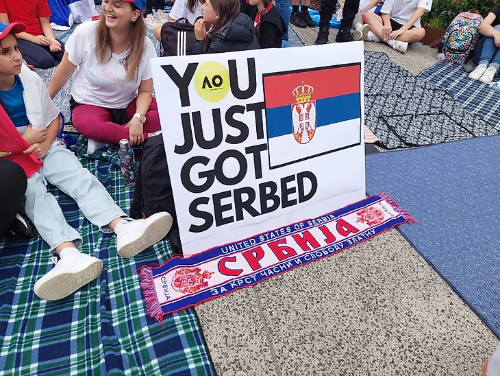 В Австралии Джоковича всегда поддерживает огромная группа фанатов с сербскими корнями, на трибунах всегда видно множество флагов Сербии и плакатов о величии Новака. А в Белграде есть много муралов, посвященных герою, и практически на любом углу можно купить футболку с его лицом.