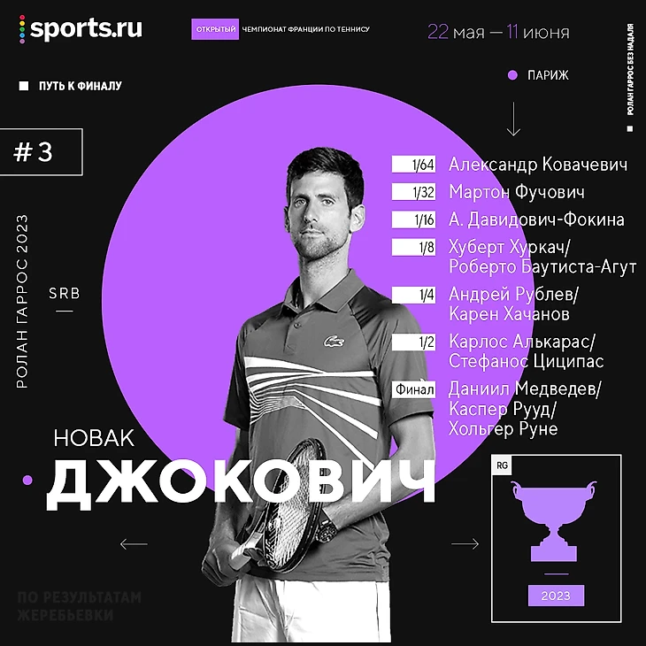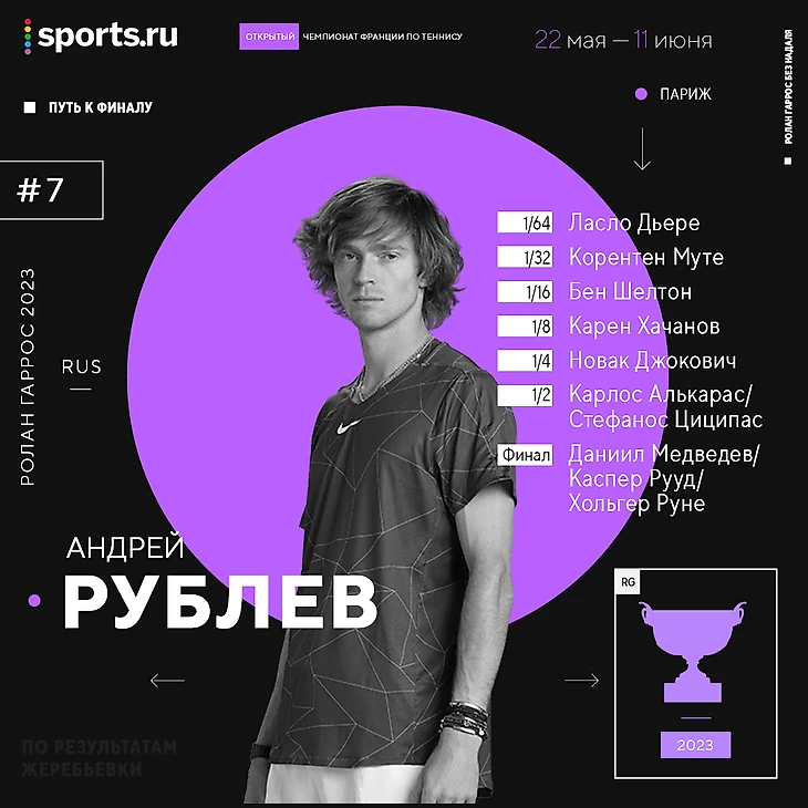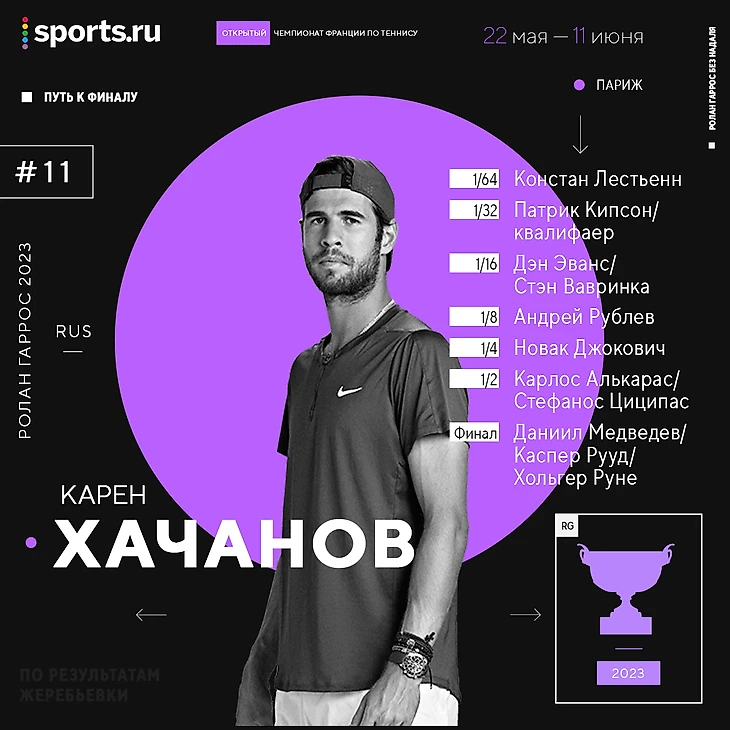 У них одинаковая картина – три вполне проходимых круга, а потом встреча друг с другом в четвертом. И дальше у победителя, скорее всего, будет Новак Джокович. В этом году Хачанов и Рублев уже дважды встречались на грунте, и счет 1:1. Так что их потенциальная встреча должна стать одной из самых интересных в 1/8 финала.