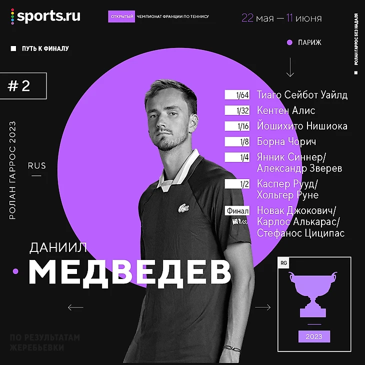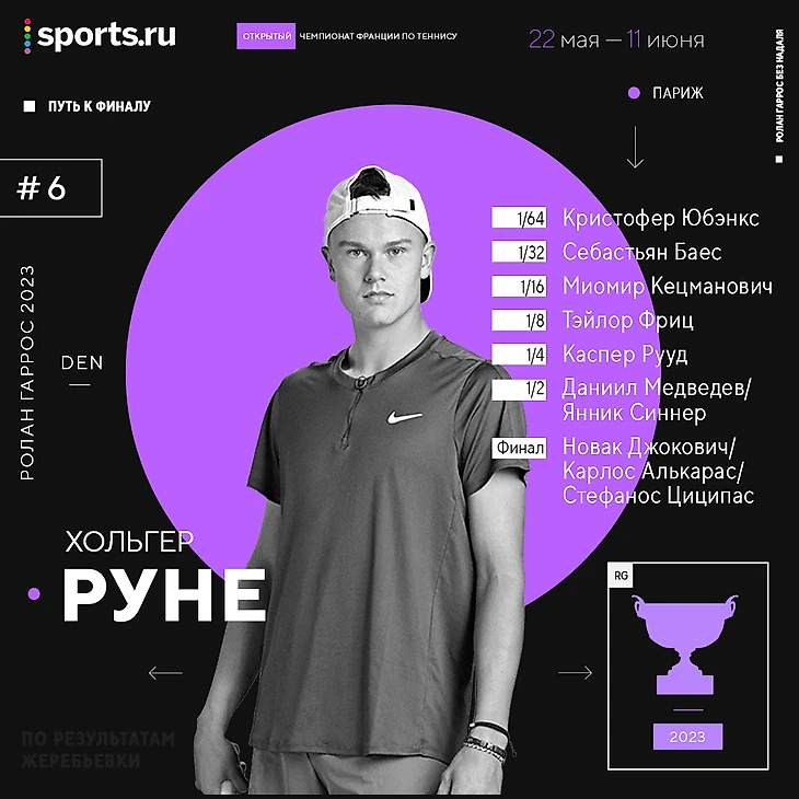 О Синнере вообще ни слова. А это игрок, который за три года на РГ проигрывал только Надалю (дважды, оба раза создавал Рафе проблемы) и травме (выиграл первый сет 6:1 у Рублёва). Если Янник будет в форме, то в нижней половине он фаворит.