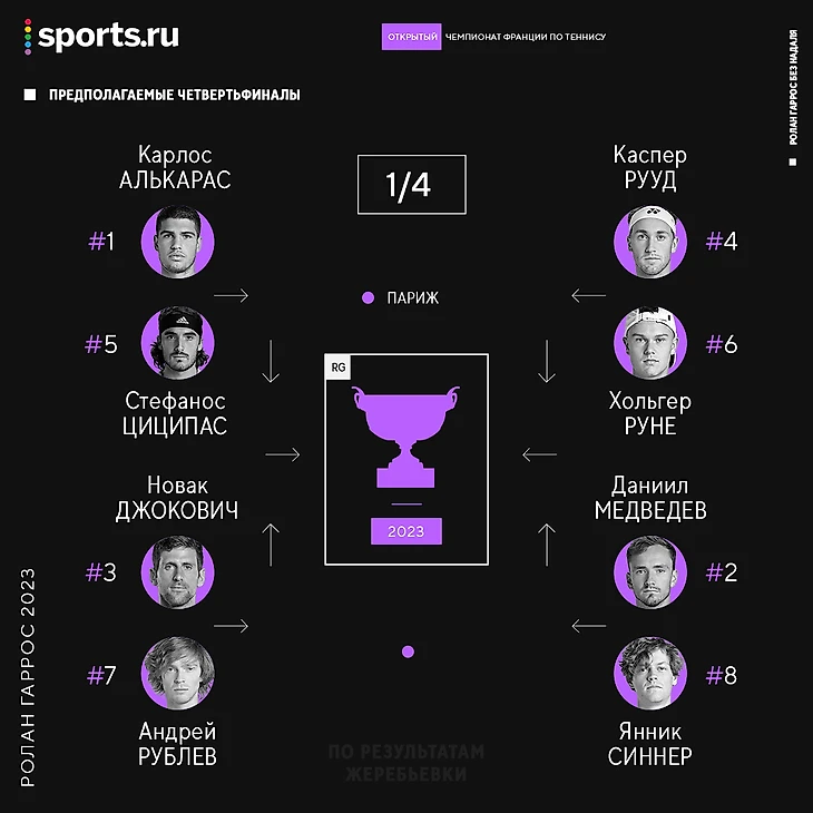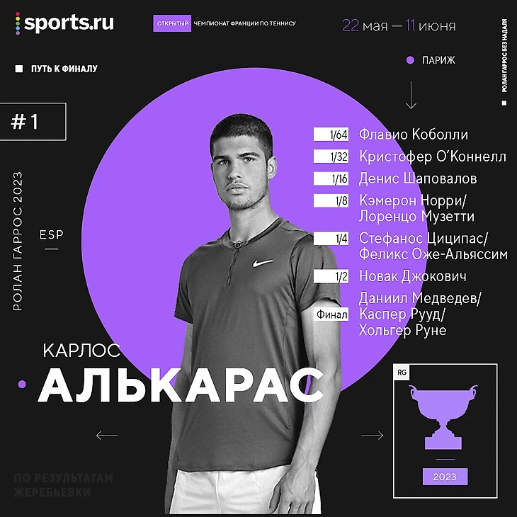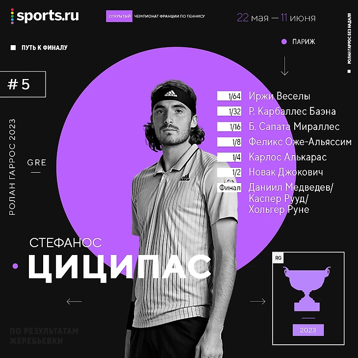У Циципаса, да, очень простая сетка, но это может и сыграть злую шутку когда после придётся играть с игроком уровня Алькараса. Со времён, когда он был в одном сете от победы на РГ, ооочень многое поменялось, поэтому там в любом случае почти всё от Алькараса будет зависеть.