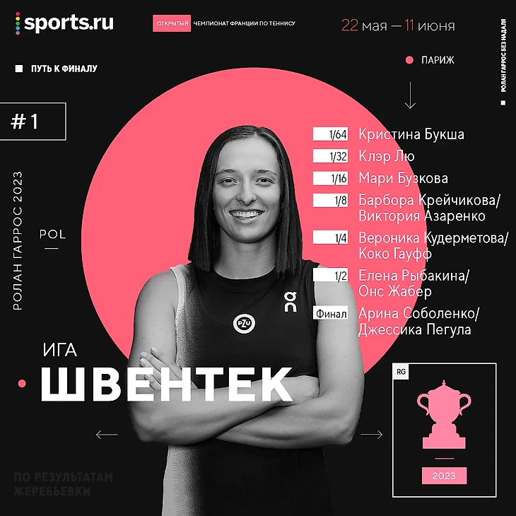 В женской сетке поразительным образом автор считает, что у Швентек самые сложные соперницы до полуфинала Кудерметова и Гауфф, но не замечает в 1/8 Крейчикову -- победительницу РГ-21 и крайне неудобную для Иги соперницу; наверно, единственную теннисистку в мире, с которой она не хотела бы играть на грунте.