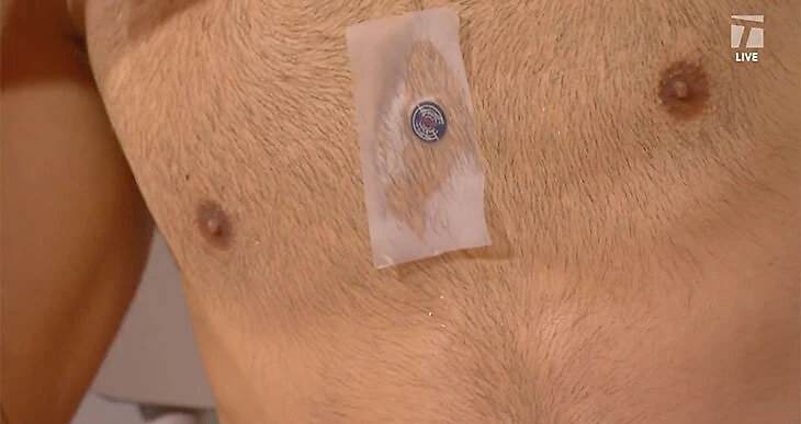 Но там вроде они замеряли уровень электролитов, а у Джоковича, судя по расположению, нагрудный пульсометр. Обычно они закрепляются с помощью пояса, но тут решили видимо скотчем воспользоваться.