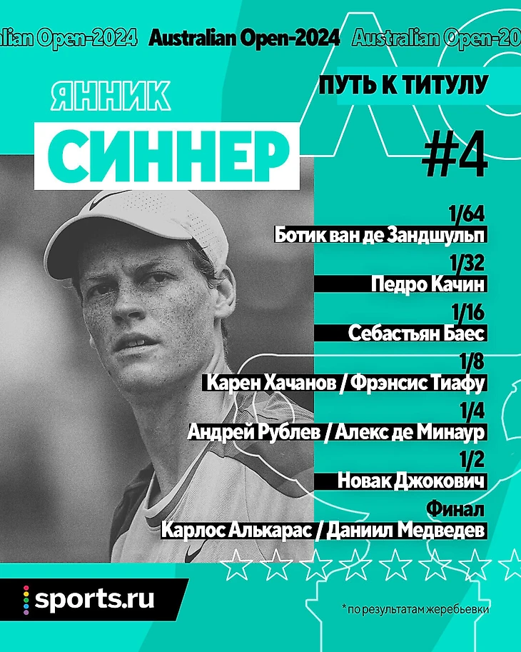 Правда, путь Рублева выглядит сложнее – Корда в третьем круге, дебютант топ-10 Де Минаур в четвертом. Да и Синнер в борьбе за первый полуфинал ТБШ – не самый уютный вариант.