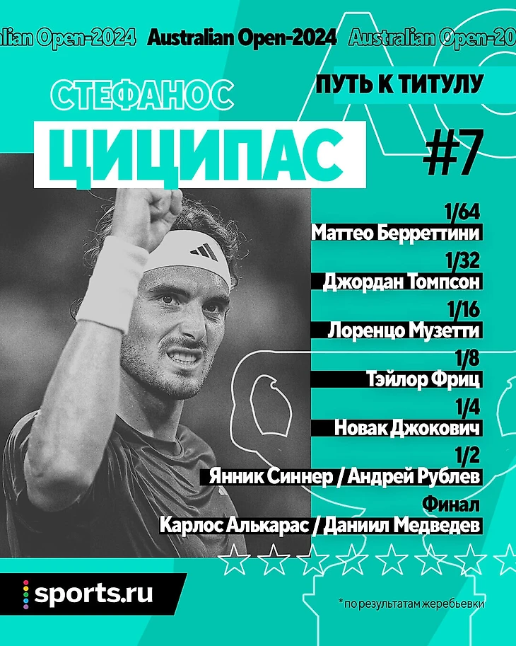У Стефаноса Циципаса из фаворитов сетка, наверное, самая сложная. Уже в первом круге суперматч с Берреттини, во втором – Джордан Томпсон (обыгравший Надаля в Брисбене), в третьем – талантливый Музетти, в четвертом – всегда опасный Фриц. А в 1/4 – Джокович, которого он не обыгрывал с 2019-го.