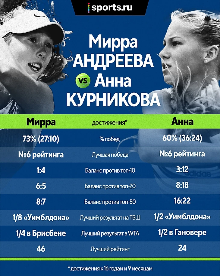 Это иллюстрирует наш любимый тезис – что Курникова была супертеннисисткой, особенно в молодости. Потому что результаты у нее были лучше, чем у Андреевой – которую никто не называет неудачницей. А еще то, что хорошие результаты в юности не гарантируют кучи титулов в будущем.