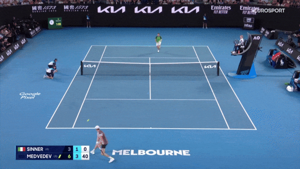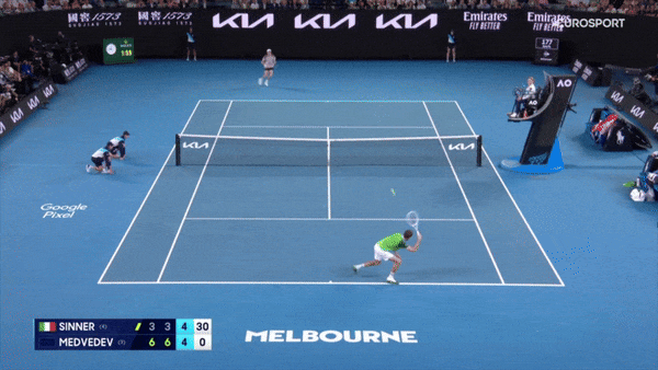 Геймбол – длинный размен, Медведев первым нашел углы, растащил Синнера по корту и выжал ошибку.