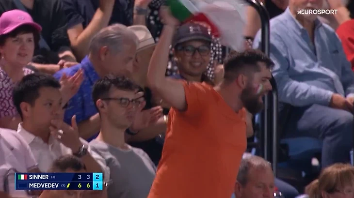 Синнер вел 30:15, но положил двойную ошибку. Пошел на очень агрессивную вторую подачу, потому что Медведев другие просто уничтожает.